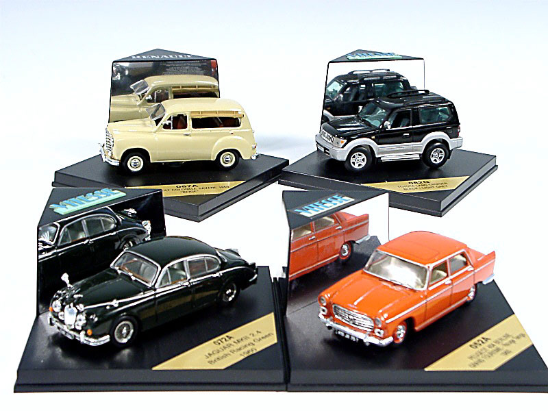 miniatures reproduisant les marques : RENAULT, JAGUAR, TOYOTA & PEUGEOT - avec un suremballage en carton
