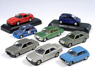 miniatures reproduisant les marques : CITROËN, PEUGEOT, RENAULT, FERRARI & MERCEDES - un modèle en état 'C' - 2 modèles avec boîte