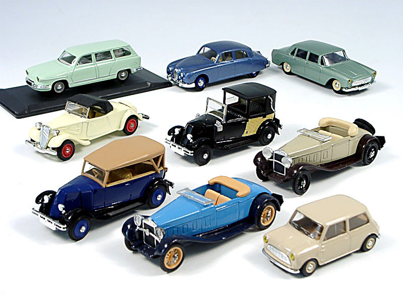 miniatures reproduisant les marques : CITROËN, JAGUAR, LANCIA, AUSTIN, RENAULT & DELAGE - manque roues de secours sur l'un des modèles - un modèle avec boîte