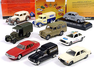 miniatures reproduisant les marques : PEUGEOT, LAND ROVER, RENAULT, CITROËN, FORD & PACKARD - 3 modèles avec boîte dont un avec planche de décalques