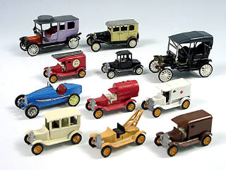 états entre 'A' & 'D' - manque un phare sur un modèle & un levier de vitesse sur un autre - petits détails de peinture ajoutés - miniatures reproduisant les marques : FORD, PANHARD & LEVASSOR & BUGATTI - on y retrouve les marques RAMI & EFSI