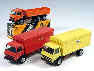on y retrouve : 2 fourgons bâchés 'AVIS' & 'HERTZ' & un benne 'MARREL' avec sa boîte