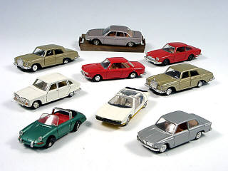 miniatures reproduisant les marques : RENAULT, MERCEDES, PORSCHE, BMW, LAMBORGHINI & NSU - tous les modèles ont les jantes fondues - 3 modèles en état 'C' dont un avec sigle de calandre cassé - un modèle avec boîte