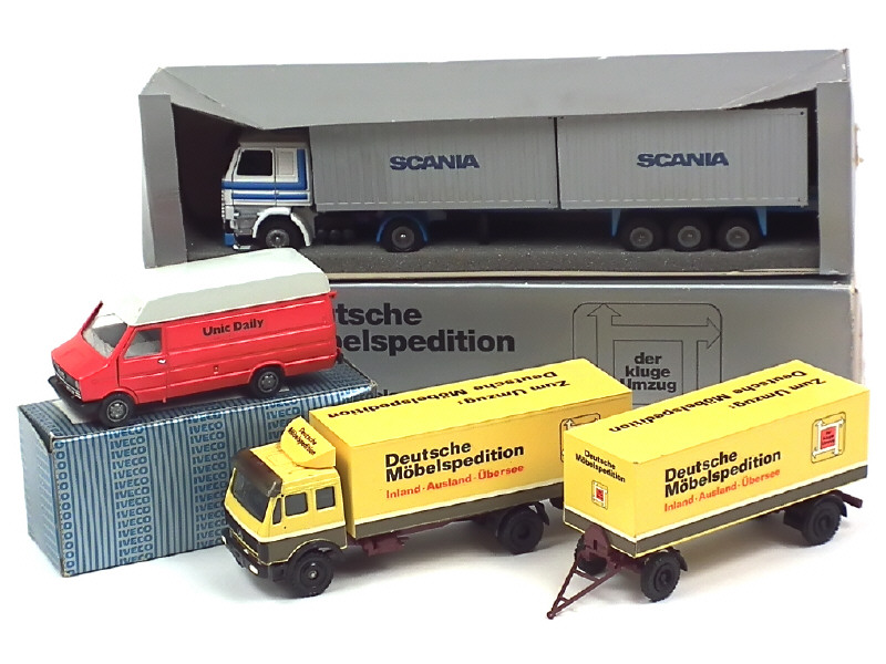 comprend : IVECO 'UNIC DAILY' (un éclat important sur le châssis), MERCEDES-BENZ 'DEUTSCHE MOBELSPEDITION' (avec sachet d'accessoires) & SCANIA 142H 'SCANIA' (avec accessoires) - on y trouve les marques : CONRAD, OLD-CARS & TEKNO HOLLAND - 2 boîtes non-conformes aux modèles