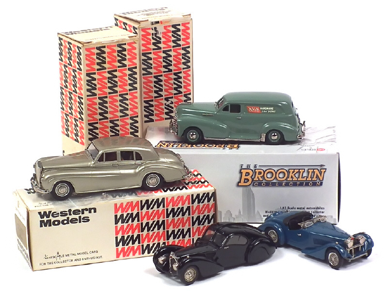 états de 'A' à 'B' - comprend : BUGATTI 57 CORSICA TOURER 1938 (pare-brise à recoller), TYPE 57 SC ATLANTIC 1938, ROLLS ROYCE SILVER CLOUD III 1964 (sigle & rétroviseurs sous sachet) & CHEVROLET SEDAN DELIVERY 1947 - on y retrouve les marques : WESTERN MODELS & BROOKLIN