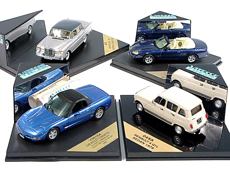 modèles reproduisant les marques : MERCEDES, RENAULT, JAGUAR & CHEVROLET - rétroviseur cassé sur un modèle - 2 boîtes en état 'C' - un modèle en série limitée avec certificat 1694/2500