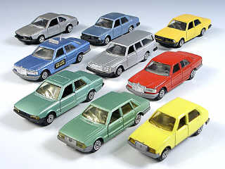 miniatures reproduisant les marques : MERCEDES, PEUGEOT, ALFA ROMEO, VOLVO, BMW, TALBOT & CITROËN