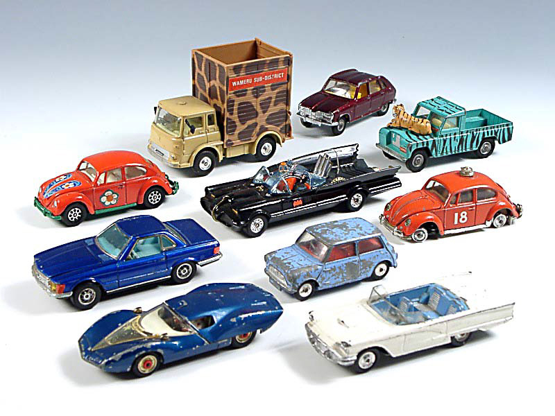 miniatures reproduisant les marques : RENAULT, VOLKSWAGEN, MORRIS, FORD, MERCEDES - CHEVROLET, voiture de BATMAN & véhicules de DAKTARI - états de 'D' à 'F'