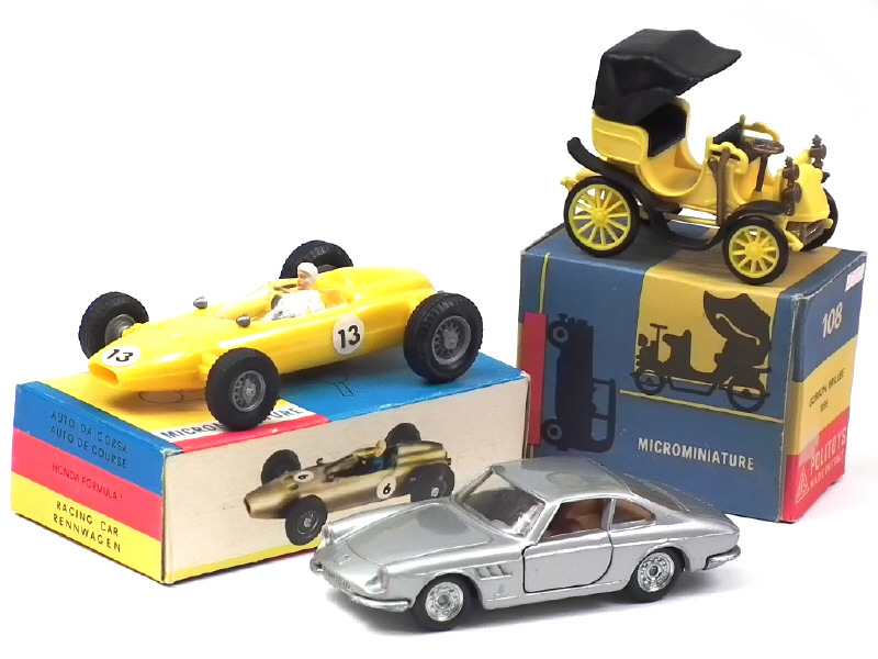 série 'MICROMINIATURE' - comprend : HONDA F1 & GOBRON BRILLIE 1899 - on y joint une FERRARI 330 GTC (état 'B', un petit éclat sur le toit sans boîte)