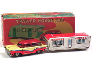 longueur de l'ensemble : 23 cm - contient un break (moteur à friction fonctionne) & une caravane en tôle lithographiée
