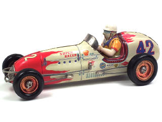 longueur 46 cm - moteur à friction (à revoir) - avec roues démontables - retouches plus ou moins importantes avec quelques parties repeintes (notamment le casque du pilote & un élément de châssis)