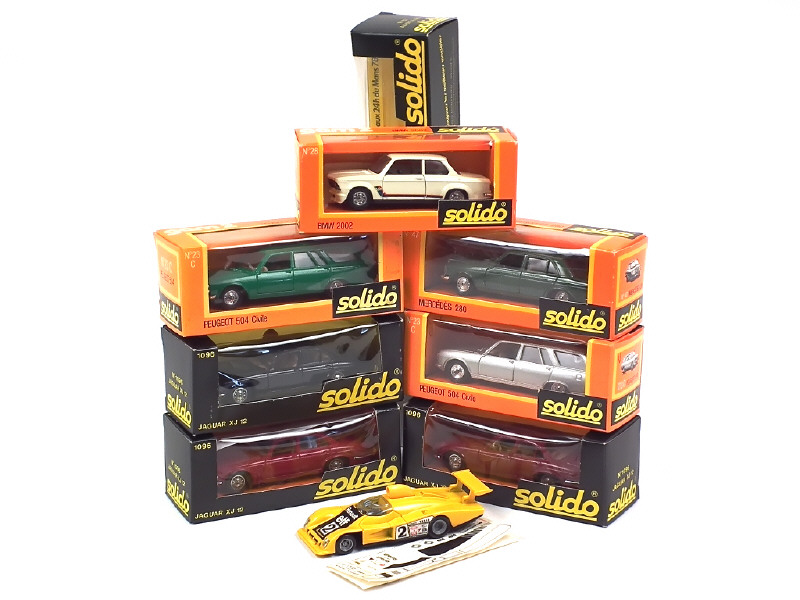 comprend les modèles : JAGUAR XJ12 (3 exemplaires), MERCEDES 280, BMW 2002, PEUGEOT 504 break (2 exemplaires) & ALPINE A442 - manque de papier sur quelques boîtes