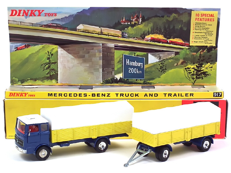 DINKY TOYS (GB) 917 MERCEDES Bâché avec remorque bâchée bleu foncé & jaune, bâches blanches