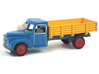 avec étiquette d'origine de la marque - réalisation en bois peint - longueur 51 cm - très légères craquelures par endroits avec traces d'oxydation sur les enjoliveurs de roues - manque un support de ridelles - avec banquettes en plastique
