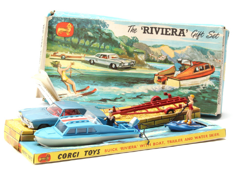 contient : BUICK RIVIERA bleu ciel (pneus plus ou moins séchés), remorque à bateau, hors-bord DOLPHIN 20 avec son capitaine, skieuse sur support flottant, notice & diorama