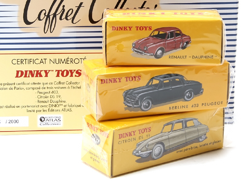 contient : CITROEN DS19 vitrée, PEUGEOT 403 & RENAULT DAUPHINE (2exemplaires sous film plastique jamais ouvert) - avec certificat d'édition limitée numéroté 1605/2000 exemplaires - avec cale de boîte