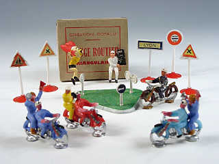 comprend : un refuge routier avec sa boîte de marque COFALU, 4 motos, une figurine du Tour de France & 5 panneaux routiers