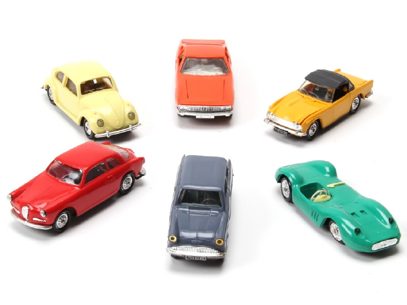 comprend : TRIUMPH TR5, MONTEVERDI 375L, ALFA ROMEO 1300, FORD ANGLIA, VOLKSWAGEN 1300 & MASERATI SPORT 200 (jantes légèrement fondues) - quelques carrosseries plus ou moins déformées