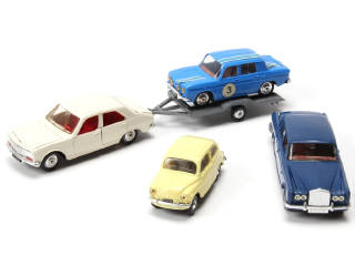 comprend : RENAULT 8 GORDINI (un autocollant incomplet), PEUGEOT 504, FIAT 600 & ROLLS ROYCE - carrosseries plus ou moins déformées