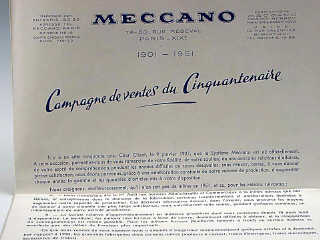présente la campagne de ventes du cinquantenaire '1901-1951' de MECCANO avec ses différents produits : le MECCANO, les trains HORNBY & les DINKY TOYS - comporte les conditions de vente, les supports publicitaires & les nouveautés