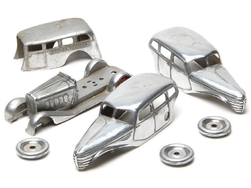 états de 'C' à 'D' - comprend : 3 carrosseries, un châssis, 3 roues & un capot-moteur (traces de métal fatigue) - avec manques & parties cassées