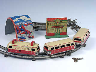 motrice en état 'D' - moteur à clef (fonctionne) - avec clef - on y joint 4 rails, un tunnel & une petite gare en tôle lithographiée