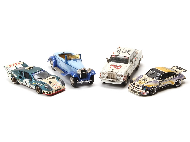 états de 'A' à 'B' - miniatures reproduisant les modèles : ROLLS ROYCE, PORSCHE, BUGATTI & LIGIER - on y retrouve les marques : TIN WIZARD, VOITURE, MINI RACING & HAMORE - quelques accessoires manquants avec traces de colle par endroits