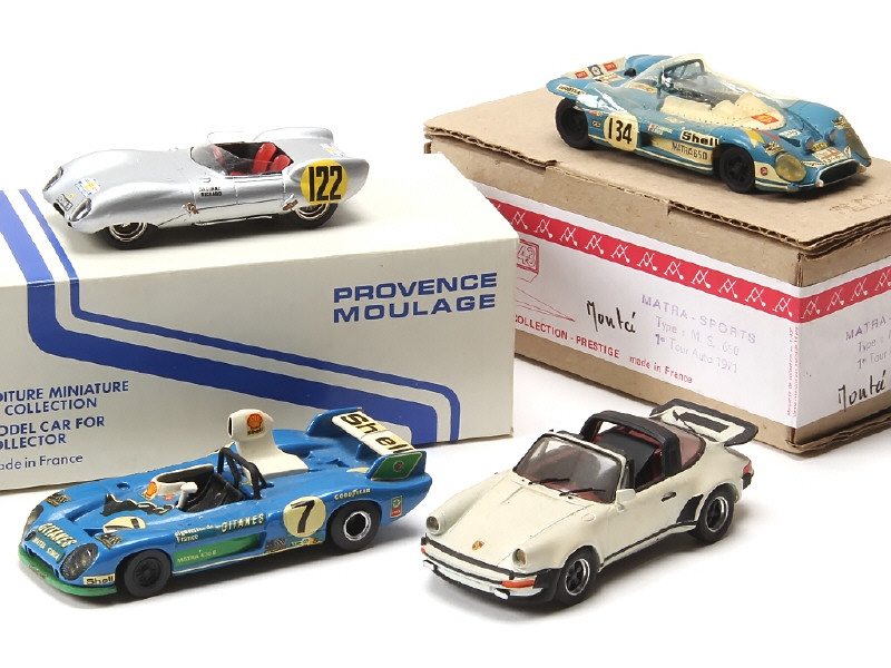 miniatures reproduisant les modèles : PORSCHE, LOTUS & MATRA - on y retrouve les marques : ELIGOR, M.R.F, PROVENCE MOULAGE & STAND 43 - quelques petits accessoires manquants - 2 exemplaires en boîte
