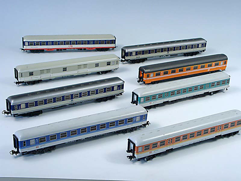 MÄRKLIN 'HO' (ALLEMAGNE) Ensemble de 7 voitures de voyageurs & un wagon fourgon