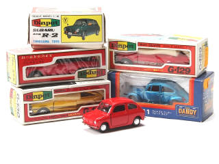 comprend : SUBARU R2, ISUZU GEMINI, MITSUBISHI GALANT, VOLKSWAGEN 1200 & TOYOTA COROLLA - on y retrouve les marques : TOMICA DANDY & YONEZAWA TOYS DIAPET - une boîte en état 'c'
