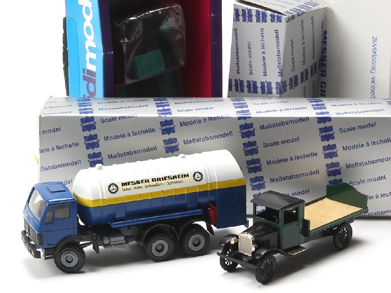 comprend : MAN semi-remorque fourgon 'SACHS', VOLVO plateau 1928, MERCEDES citerne 'MESSER' & VÖGELE super finisseuse - quelques accessoires manquants - quelques accrocs plus ou moins importants sur les boîtes