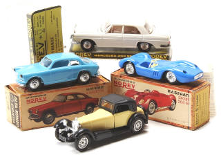 comprend les modèles : MASERATI SPORT 200, ALFA ROMEO GIULIETTA, MERCEDES 250 SE (chromes légèrement ternis) & SSK 1928 - présence de ruban adhésif sur 2 boîtes (léger manque de papier sur un socle)