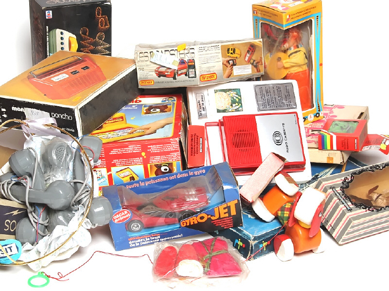 états de 'B' à 'D' - comprend notamment : mange-disque, jeu de défi musical, combinés de téléphones, audiocassette, piano en bois verni, talky-walky, voitures & battery-toy - on y retrouve principalement les marques : BBURAGO, EDUCALUX, MATCHBOX, CBS & BRITAINS - la plupart en boites d'origine états 'c' à 'd' - possibilité de manques & parties cassées