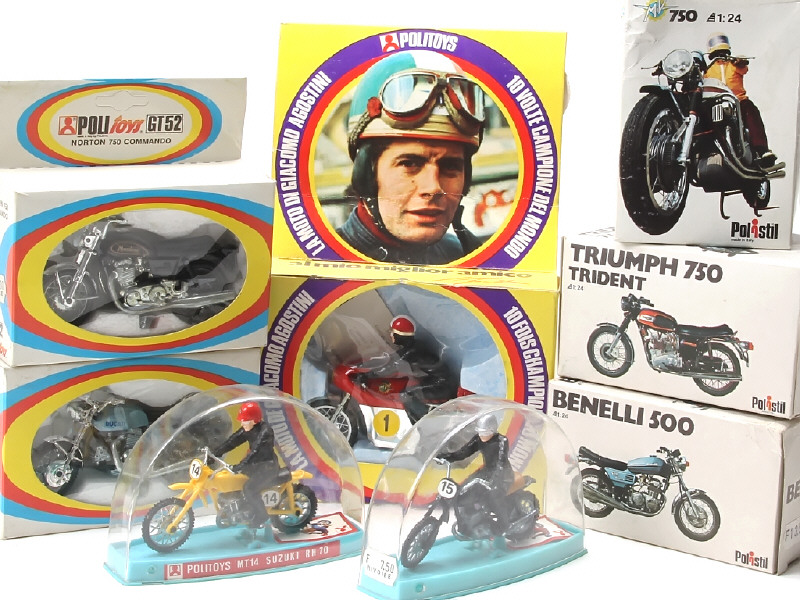 les boîtes sont en état de 'b' à 'c' - miniatures reproduisant notamment les modèles : BENELLI, DUCATI, AGUSTA, TRIUMPH, SUZUKI & MT - on y retrouve les marques : POLISTIL & POLITOYS - possibilité de petits accessoires cassés & manquants