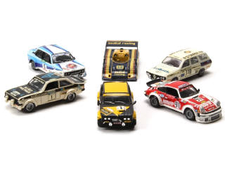 réalisations sur base SOLIDO - miniatures reproduisant les modèles : RENAULT, FIAT (2 exemplaires différents), PORSCHE (2 exemplaires différents) & FORD - quelques petits manques sur les décalques