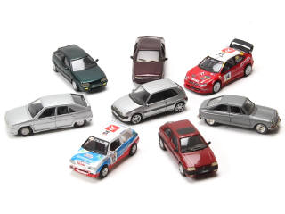 comprend les modèles : M 35, ZX 16V, BX GTI, XANTIA, SAXO (2 exemplaires différents), AX sport GTI & XSARA de rallye 'CATALUNYA' - on y retrouve notamment les marques : MINI RACING, MVI, PROVENCE MOULAGE, MINICAR & STARTER - manque quelques petits accessoires