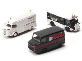 comprend les modèles : corbillard, fourgon 'POLICE' (3 pneus coupés) & croix rouge française - on y retrouve notamment la marque MINIROUTE & TRANSPUB - manque quelques grappes d'essuie-glaces