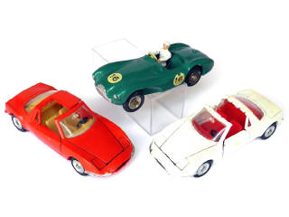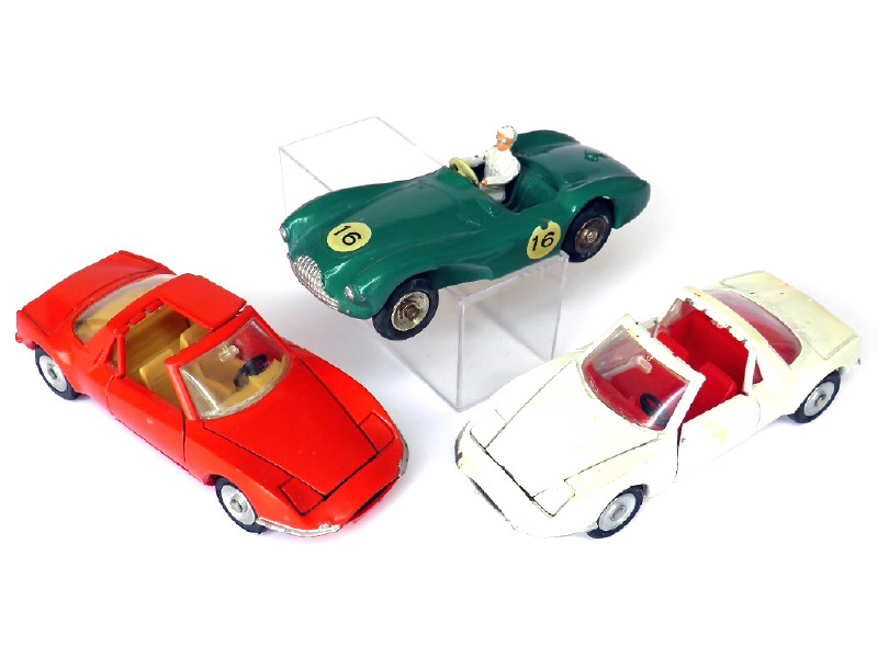 miniatures reproduisant les modèles : 2 exemplaires MATRA M530 (traces d'anciens décalques sur la blanche) & ASTON MARTIN compétition (jantes légèrement oxydées) - manque 3 demi-toit