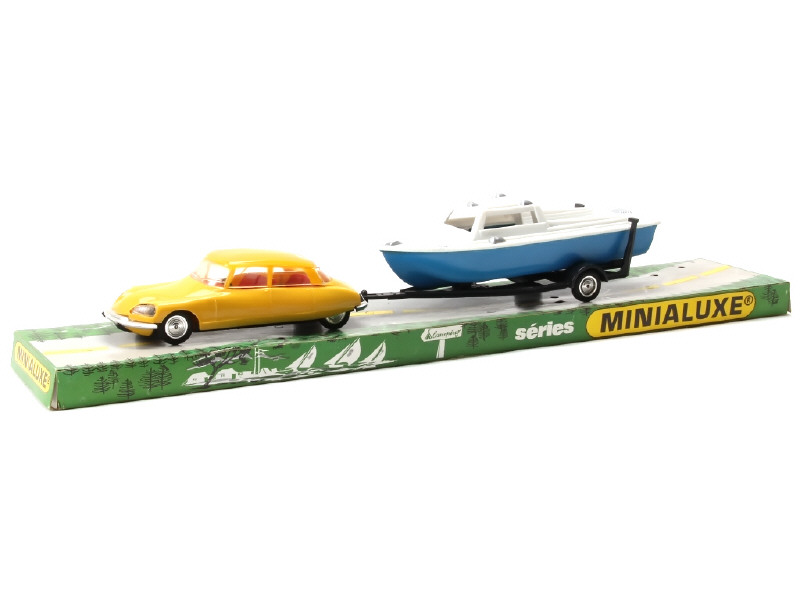 échelle 1/32ème - contient : CITROËN DS 21 (carrosserie légèrement déformée) avec bateau sur remorque - manque couvercle de boîte