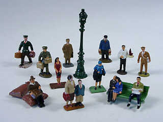 comprend : 7 voyageurs, un serveur, 2 bagagistes, un postier, un employé de gare , 2 sacs, un banc & un lampadaire