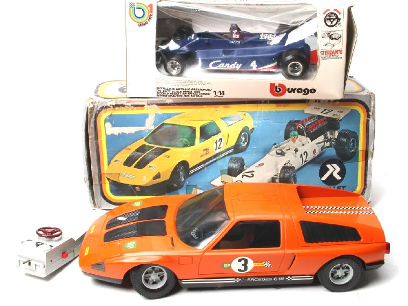 comprend : FORMULE 1 de marque BBURAGO en état 'A.b' (enfoncement sur le dessus de la boite) & MERCEDES C111 de marque ROLLET (43 cm) télécommandée (monteur à piles non testé) en état 'B.c', manque sigle de capot & parties de décalques, télécommande abimée, quelques frottements