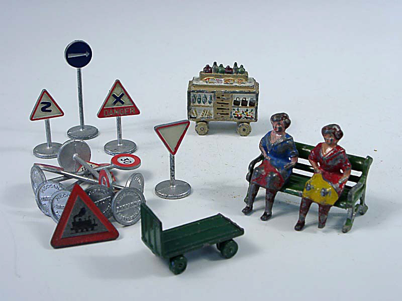comprend : 2 figurines en état 'E', un banc, un chariot à bagages, un chariot de vente ambulante & un panneau triangulaire