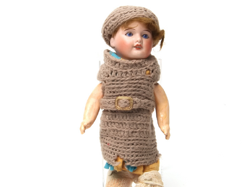 tête en biscuit marquée en creux UNIS FRANCE 60/71/140 derrière la tête et 10/0 au cou (28 cm) - yeux bleus dormeurs sans cils - bouche ouverte sur une rangée de 4 dents - pas de fèle apparent au test de la lampe - corps en composition probablement pas d'origine - petite calotte en carton et reste de péruque en mohair - vêtements anciens pas d'origine