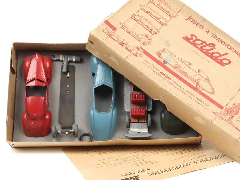 dimensions du coffret : 26,5 X 14,5 cm - contient : 3 carrosseries différentes (coupé, fuseau & cabriolet semi-capoté), un châssis motorisé (moteur à clef non testé), un axe & ses 2 roues, un élément de plancher, une clef & notice - sur socle de présentation avec ficelles de maintien d'origine - petites traces de métal fatigue (un petit manque de matière sur un capot-moteur) & manques de peinture par endroits (principalement sur une capote)
