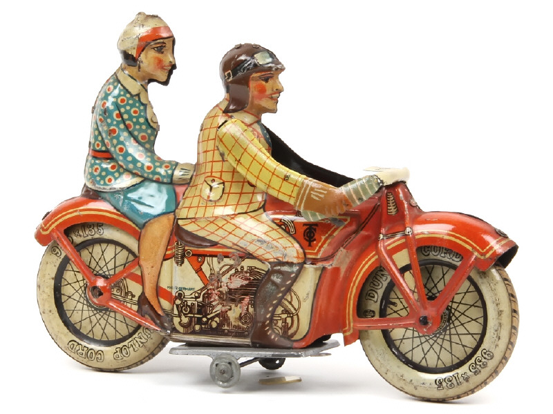 longueur : 24 cm - moteur à ressort (fonctionne) - sans phare électrique - quelques frottements plus ou moins importants par endroits avec petites traces d'oxydation - intérieur des bras du conducteur repeint avec guidon restauré