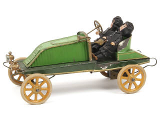 longueur : 32 cm - avec moteur à clef (à revoir) & 2 personnages en composition & porcelaine (un pied recollé & l'autre incomplet sur un exemplaire) - véhicule assemblé en 2 parties (avec capot & sièges amovibles) & équipé d'un système permettant la désolidarisation de celles-ci lorsque le modèle cogne un obstacle - pneus séchés - petites traces d'oxydation avec légères retouches sur le plancher - importants manques de peinture par endroits (notamment sur les sièges)