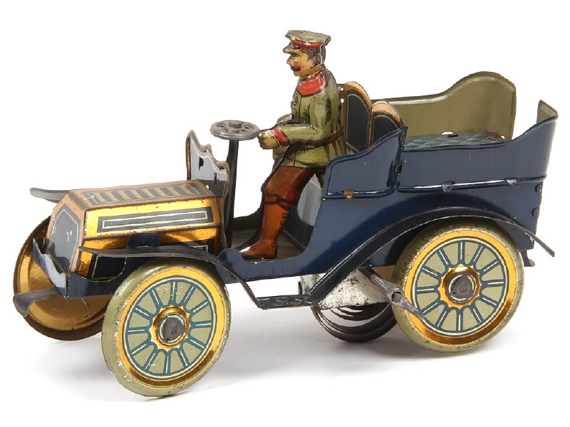 DIVERS (ALLEMAGNE) Automobile du début du XXème siècle en tôle lithographiée bleu, noir & or