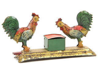 DIVERS Coqs avec mangeoire en tôle lithographiée rouge, vert & or
