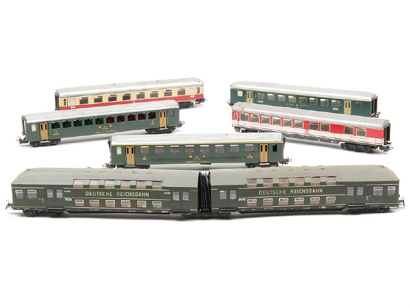 3 wagons en état 'C' - réseaux allemand & suisse - on y retrouve notamment les marque MÄRKLIN - avec quelques traces d'oxydation - soufflet de l'autorail à refixer