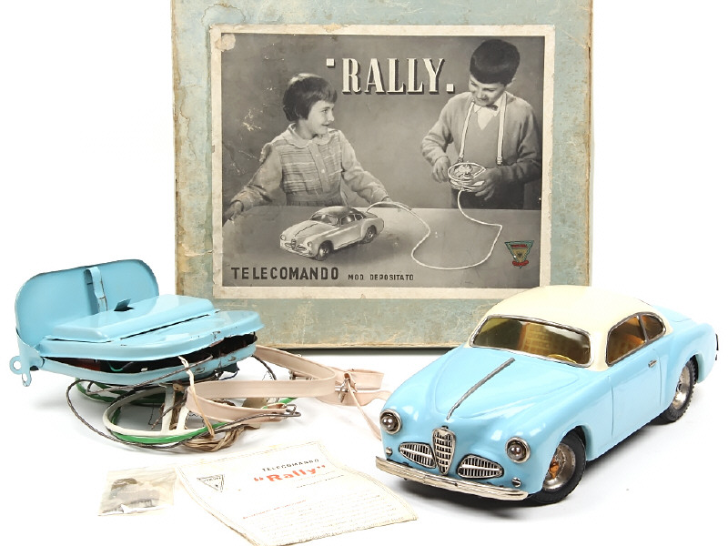 contient : une ALFA ROMEO téléguidée (longueur : 36 cm, moteur à piles & direction à revoir) - manque un papillon de roue - la télécommande (avec volant, légèrement déformée) est en état 'C' avec éléments manquants, câblage endommagé & coupé - coffret restauré (avec notice)